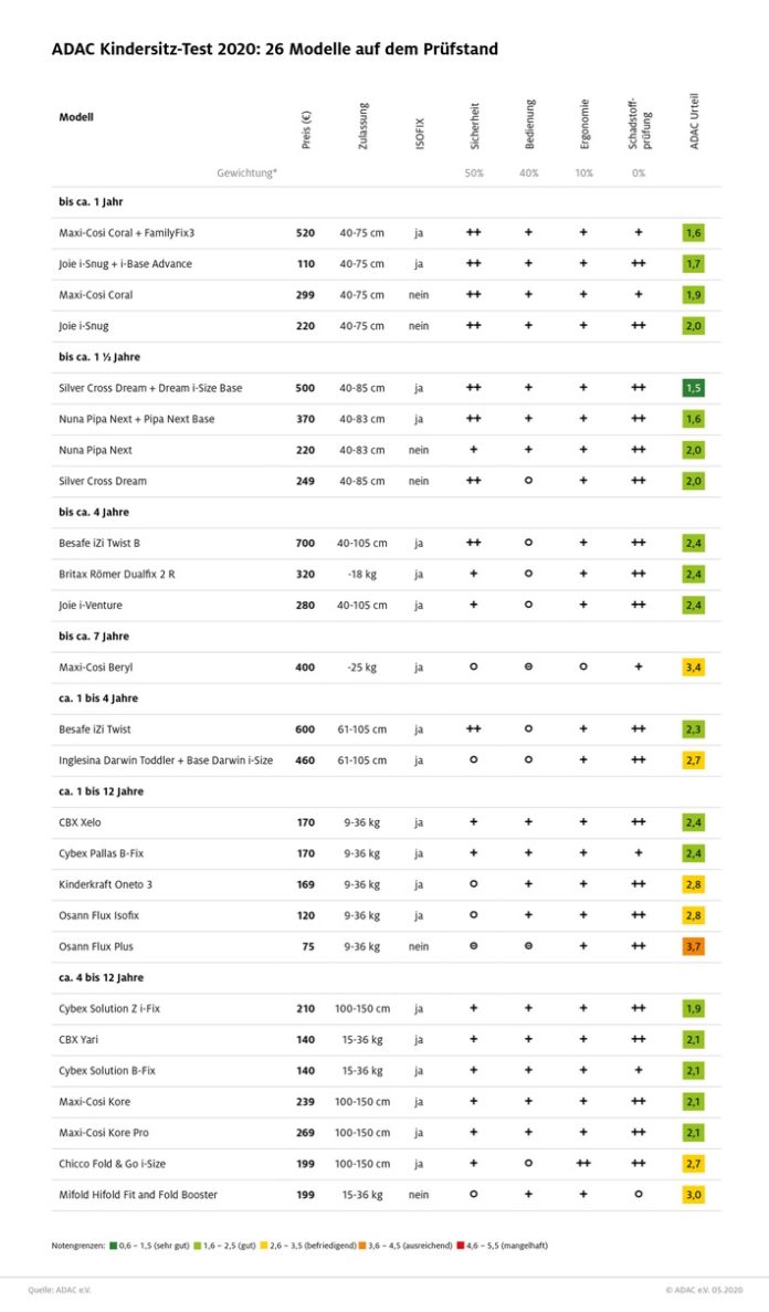 Weitere Details zu den einzelnen Sitzen gibt es unter https://adac.de/kindersitztest