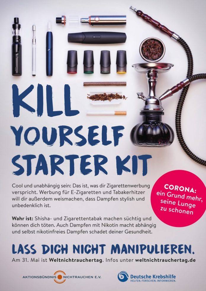 Bonn (ots) – Jugendliche und junge Erwachsene werden in hohem Maße von den Marketingstrategien der Tabakindustrie angesprochen – so werden neue Generationen abhängiger Konsumenten gewonnen. „Kill yourself starter kit – Lass dich nicht manipulieren“ lautet daher in Deutschland das Motto des diesjährigen Weltnichtrauchertags am 31. Mai. Das AKTIONSBÜNDNIS NICHTRAUCHEN (ABNR), das Deutsche Krebsforschungszentrum (DKFZ) und die Deutsche Krebshilfe nehmen dies zum Anlass, speziell junge Menschen über die Marketingstrategien der Tabakwirtschaft zu informieren. Denn das Experimentieren mit Shishas und E-Zigaretten kann den Start in eine Nikotinsucht sowie wahrscheinlich ein späteres Ausprobieren von Tabakzigaretten begünstigen. Das Bündnis aus Gesundheitsexperten fordert die Bundesregierung daher dazu auf, längst überfällige Maßnahmen der Tabakprävention umzusetzen und auch E-Zigaretten stärker zu regulieren.