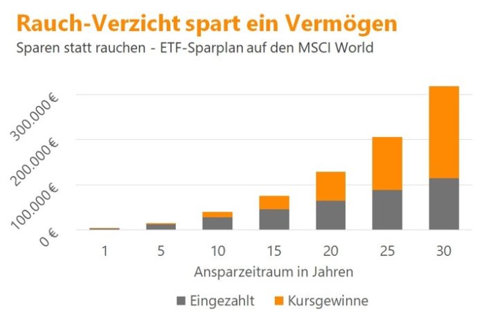 Ex-Raucher mit einem täglichen Konsum von einer Schachtel sparen durch den Tabakverzicht etwa 204 Euro im Monat. Die Verivox-Hochrechnung zeigt: Wer das eingesparte Geld in einen Fondssparplan steckt, kann damit in 30 Jahren ein Vermögen von 319.000 Euro ansparen – nicht garantiert, aber absolut realistisch.