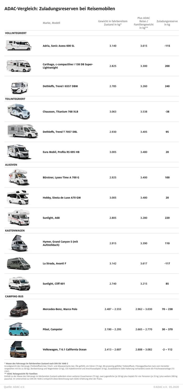 Die Klasse der kleinen Campingbusse hat hingegen oft noch reichlich Reserven für die Zuladung. Dies ist aber unter anderem darauf zurückzuführen, dass in diesen Fahrzeugen die Nasszelle fehlt. Der ADAC empfiehlt jedoch, beim Kauf oder der Anmietung des Fahrzeugs die Motorisierung und das Getriebe zu berücksichtigen. Beides kann die Zuladungsreserven deutlich beschränken. So variiert der VW California in seinem Leergewicht um 200 kg. Auch die optionalen Allradantriebe von Mercedes Marco Polo und VW California schlagen sich auf der Waage nieder.
