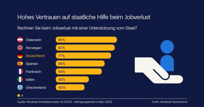 Die Deutschen vertrauen auf ihren Staat und seine Institutionen. Zumindest rechneten bisher 77 % der befragten Arbeitnehmer damit, dass die Bundesagentur für Arbeit und die Regierung Menschen beim Jobverlust finanziell unterstützt oder hilft, einen neuen Job zu finden. Im europäischen Vergleich waren die Arbeitnehmer von nur zwei anderen Ländern zuversichtlicher: Norwegen (82,2 %) und Österreich (84,9 %). Im vom Virus hart-getroffenen Italien sah sich mehr als die Hälfte der Bevölkerung beim Jobverlust hingegen auf sich selbst gestellt (53,6 %). Das zeigen die Befragungsergebnisse des Randstad Arbeitsbarometers (Hj.1/2020), das Arbeitnehmer kurz vor den Lockdown-Maßnahmen befragte.