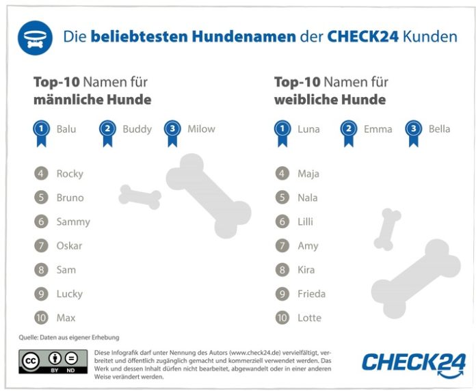 Der beliebteste Hundename der CHECK24-Kunden ist Luna. Rüden werden am häufigsten Balu genannt. Ebenfalls besonders beliebte Namen sind Emma, Bella, Buddy und Milow.