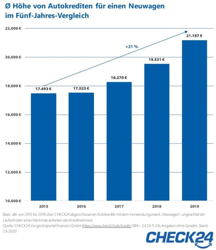 – Fünf-Jahres-Vergleich: Kreditsumme für einen neuen PKW um 21 Prozent gestiegen – Geschlechterunterschied: 75 Prozent der Kreditnehmer für einen Neuwagen sind Männer – Ãber 300 CHECK24-Experten beraten bei Fragen rund um den digitalen Kreditabschluss