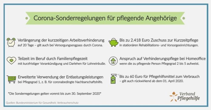 Um während der Corona-Pandemie die häusliche Versorgung bestmöglich und schnell zu organisieren, fasst der Verband Pflegehilfe die wichtigsten Sonderregelungen für Angehörige, pflegende Angehörige und Pflegebedürftige kurz zusammen.