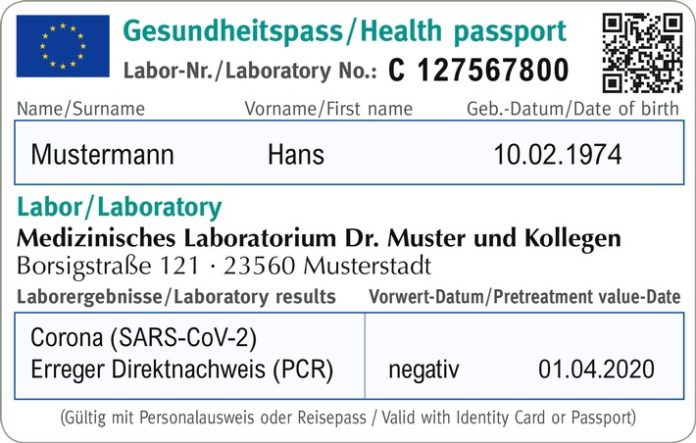 Wie könnte das konkret aussehen? Wer zukünftig ins europäische Ausland reisen will, unterzieht sich vor der Abreise einem SARS-CoV-2-Test. Der entnommene Nasen- und Rachenabstrich wird dann einem akkreditierten Fachlaboratorium übermittelt, wo Laborfachärzte die Untersuchung auf das Virus SARS-CoV-2 durchführen. Der laborärztliche Befundbericht dokumentiert das Ergebnis der Untersuchung auf Virus Direktnachweis (PCR). Diese Verfahrensweise ist bereits in Arztpraxen und Laboratorien etabliert und erfüllt die medizinischen Qualitätsanforderungen.