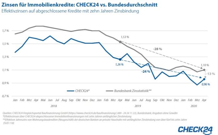 Die Immobilienzinsen bleiben auf einem niedrigen Niveau. Im April 2020 haben CHECK24-Kunden im Schnitt 0,96 Prozent effektiv für Baudarlehen mit zehn Jahren Zinsbindung gezahlt. Im Vorjahreszeitraum waren es noch 1,26 Prozent. Das entspricht einer Senkung um 24 Prozent innerhalb eines Jahres.*