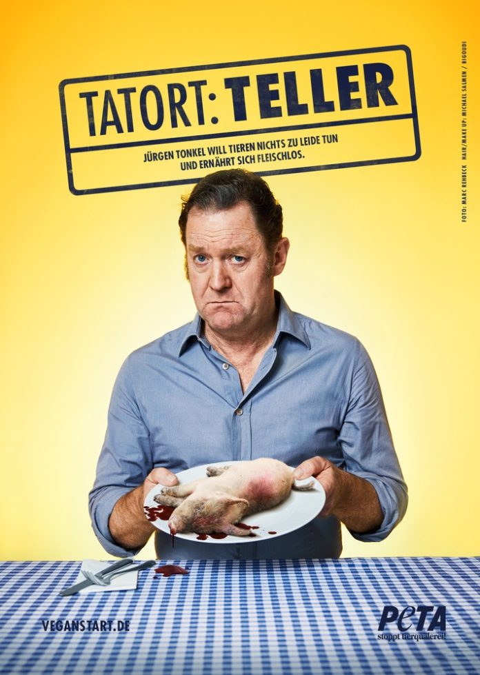 München / Stuttgart (ots) – Da schaut man zweimal hin: Jürgen Tonkel ist auf einem neuen PETA-Motiv (https://www.peta.de/juergen-tonkel-tatort-teller) zu sehen, das erschreckend direkt den Fleischkonsum thematisiert – mit einem toten „Ferkel“ auf dem Teller. Der bekannte Münchner Schauspieler möchte seinen Teller nicht zum Tatort werden lassen. Deshalb appelliert er nun an alle Tierfreunde, ebenfalls Fleisch von ihrer Speisekarte zu streichen.