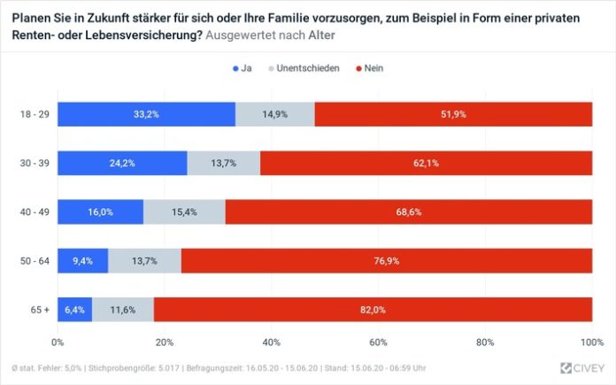 Diese Unsicherheit führt jedoch nicht zu einer umfassenden Planung von privater Altersvorsorge. Nur 15 Prozent der Deutschen über 18 Jahren planen für sich und seine Familie vorzusorgen, beispielsweise über eine Renten- und Lebensversicherung. Über 70 Prozent planen keine weitere private Absicherung. Besonders die Unterschiede bei der jungen Zielgruppe zwischen 18 und 29 Jahren zeigen die Diskrepanz zwischen Unsicherheit und fehlenden privaten Investitionen. Während sich über 60 Prozent der unter 30-Jährigen nicht ausreichend fürs Alter abgesichert fühlen, plant nur jeder Dritte eine private Vorsorge. In dieser Altersgruppe werden vor allem Misstrauen gegenüber den Anbietern, fehlender finanzieller Spielraum und keine attraktiven Angebote als Gründe genannt. Die gleichen Aspekte treffen auch auf die Gruppe der 30- bis 39-Jährigen zu, sofern sie sich nicht schon ausreichend abgesichert fühlen.