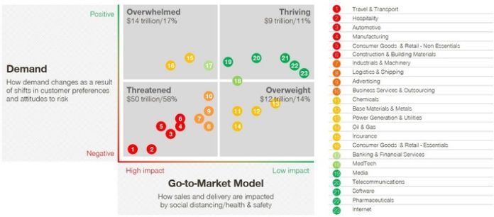 Eine aktuelle Expertenanalyse von Simon-Kucher & Partners liefert neue Erkenntnisse darüber, wie stark die Covid-19-Pandemie Unternehmen rund um den Globus bedroht. Das Ergebnis: Unternehmen lassen sich in vier Kategorien einteilen: florierend (thriving), überfordert (overwhelmed), unausgelastet (overweight) und bedroht (threatened). Bei der Untersuchung von Nachfrageschwankungen in den unterschiedlichen Branchen, ausgelöst durch veränderte Kundenvorlieben und -verhalten, sowie von neuen Herausforderungen im Vertrieb durch Kontaktbeschränkungen und gesetzliche Auflagen, berechneten die Experten für jede Branche die Auswirkungen anhand eines Punktesystems*. Davon ausgehend erstellte Simon-Kucher eine Krisen-Matrix, auf der insgesamt 23 unterschiedliche Branchen einer der vier Kategorien zugeteilt werden konnten: