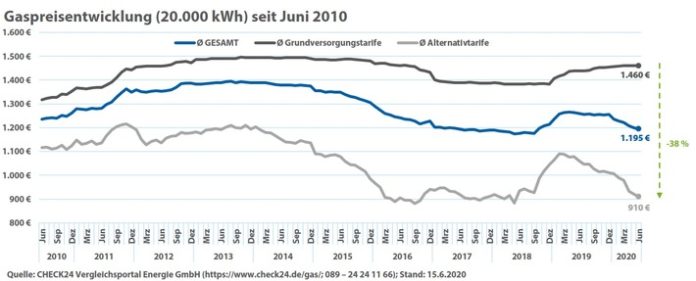 Der durchschnittliche Gaspreis (https://www.check24.de/gas/gaspreise/) für Verbraucher ist im ersten Halbjahr 2020 um drei Prozent gesunken. Im Januar zahlte eine vierköpfige Familie (Verbrauch: 20.000 kWh) 1.237 Euro für Gas, im Juni 1.195 Euro.