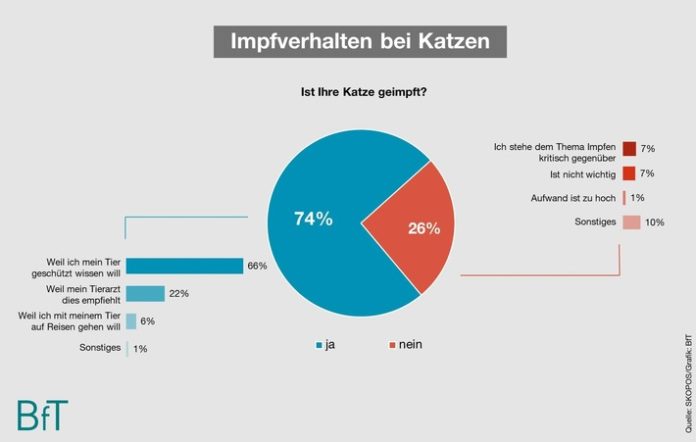 Laut einer aktuellen Umfrage des Marktforschungsinstituts Skopos im Auftrag des Bundesverbandes für Tiergesundheit e. V. (BfT) legen die meisten Tierhalter großen Wert darauf, ihre Hunde und Katzen durch Impfung vor Krankheiten zu schützen. Laut Umfrage lassen 89 Prozent der Hundehalter und 74 Prozent der Katzenhalter ihre Tiere impfen. Nicht abgefragt wurde, wie häufig und gegen welche Krankheiten geimpft wurde oder wie lange die letzte Impfung zurückliegt.