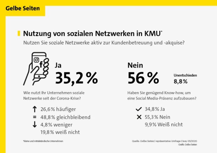 Frankfurt (ots) – Soziale Netzwerke sind für Unternehmen ein wichtiges Tool, um mit Kunden in Kontakt und wirtschaftlich erfolgreich zu bleiben. Dennoch stellt die Nutzung für viele kleine und mittelständische Betriebe eine große Herausforderung dar: 56 Prozent der KMU haben keine Social Media-Präsenz und nur 35,2 Prozent setzen bei Kundenbetreuung und -akquise auf Facebook, Instagram & Co. 8,8 Prozent sind unentschieden. Dies hat eine im Auftrag von Gelbe Seiten durchgeführte repräsentative Umfrage des Meinungsforschungsinstituts Civey ergeben.
