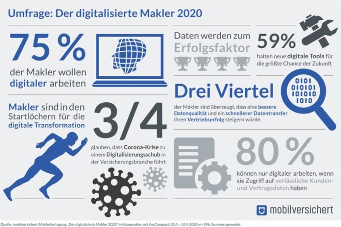 München (ots) – Makler stehen in den Startlöchern für die digitale Transformation. Das ist das Ergebnis einer Maklerbefragung, die die Brokertech-Plattform mobilversichert zum zweiten Mal in Folge in Kooperation mit der Fachzeitschrift AssCompact durchgeführt hat. Im Rahmen der Online-Umfrage „Der digitalisierte Makler“ wurden Vermittler zu Strategien, Herausforderungen und Chancen für die Zukunft befragt. Die Antworten zeigen: Die große Mehrheit der Makler will das Geschäft auf digitale Beine stellen – auch und gerade in Zeiten von Corona.