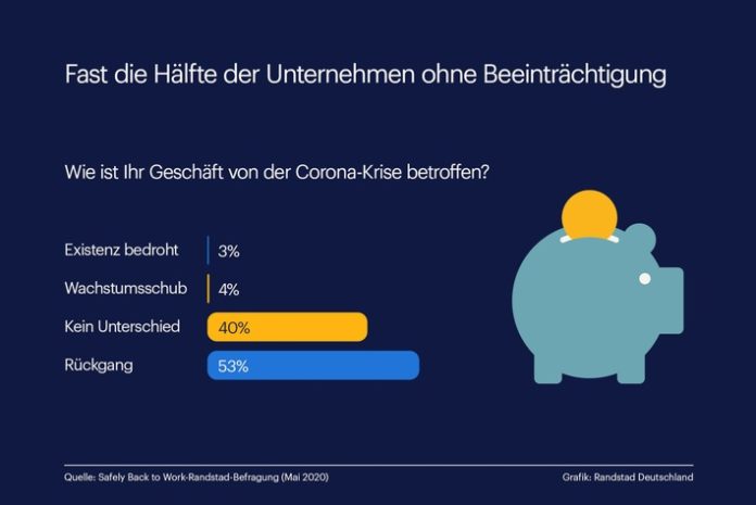 In Folge der Maßnahmen zur Eindämmung des Corona-Virus brechen weltweit ganze Märkte weg. Doch erleiden nicht alle Unternehmen Verluste, wie die „safely back to work“-Befragung von Randstad zeigt. So geben 40% von mehr als 10.000 befragten Unternehmen an, dass ihr Geschäft nicht von der Krise betroffen ist. 4% berichten gar von einem Wachstumsschub. „Krisen bieten oft Chancen – auch in diesem Fall“, sagt Richard Jager, CEO von Randstad Deutschland. „So nutzen 14% der Befragten die gegenwärtige Situation, um ihre Position am Markt dauerhaft zu stärken.“