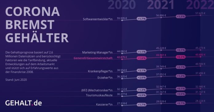 Hamburg (ots) – In den nächsten Jahren wird die Corona-Krise die Gehaltsentwicklung in Deutschland stark beeinflussen. Die Analyst*innen von Gehalt.de haben eine erste Prognose zu den Lohnsteigerungsraten in 2020 und 2021 für die Gesamtwirtschaft sowie für acht Berufsgruppen ermittelt. Das Ergebnis: Gehälter werden in diesem Jahr minimal wachsen. Das Pflegepersonal in Krankenhäusern könnte dabei noch vergleichsweise gut abschneiden. Die Entlohnung von Tourismuskaufleuten und KFZ-Mechatroniker*innen wird hingegen nahezu stagnieren. Deutlich größere Einschnitte sind für 2021 zu erwarten.