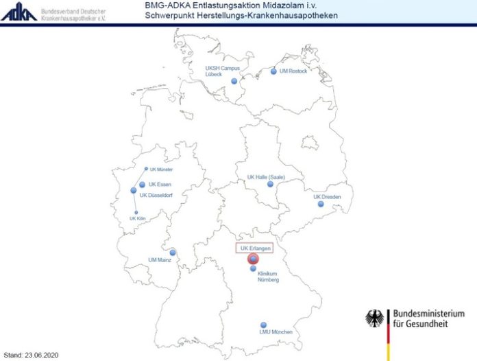 Der Wirkstoff wurde vom Bundesministerium für Gesundheit Ende April auf dem Weltmarkt beschafft und zur dezentralen Herstellung an das Netzwerk der Schwerpunkt-Herstellungs-Krankenhausapotheken des Bundesverbandes Deutscher Krankenhausapotheker überstellt. Seit Anfang dieser Woche ist etwa die Hälfte des vorgesehenen Produktionsvolumens von 100.000 Injektionsflaschen Midazolam 100mg/50ml für die bedarfsorientierte Abgabe an deutsche Krankenhaus- und krankenhausversorgende Apotheken freigegeben. Das Gesamtproduktionsvolumen ist ausreichend um ca. 3.000 beatmungspflichtige COVID-19 Patienten mit dem lebenswichtigen Medikament zu versorgen.