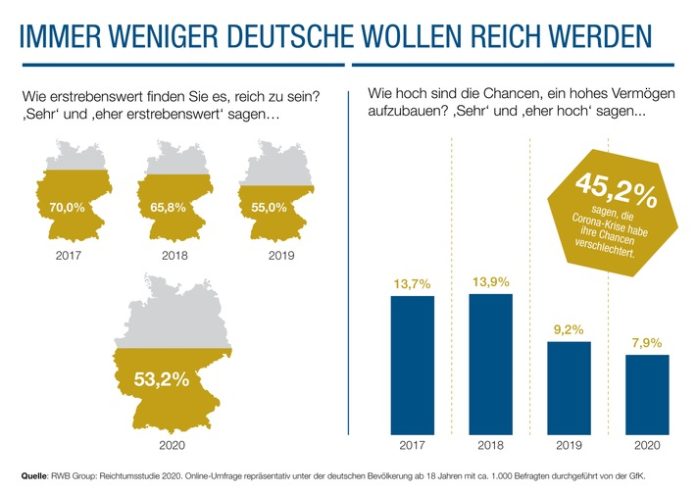 Der Anteil der Deutschen, die ihre persönlichen Chancen auf ein hohes Vermögen als sehr bzw. eher hoch einschätzen, ist mit 7,9 Prozent auf dem niedrigsten Stand seit Beginn der jährlichen Erhebung angekommen. Dabei könnte die Corona-Pandemie als Katalysator gewirkt haben. Mit 45,2 Prozent gibt fast die Hälfte der Deutschen an, die Möglichkeiten für den Vermögensaufbau hätten sich durch die Krise verschlechtert.