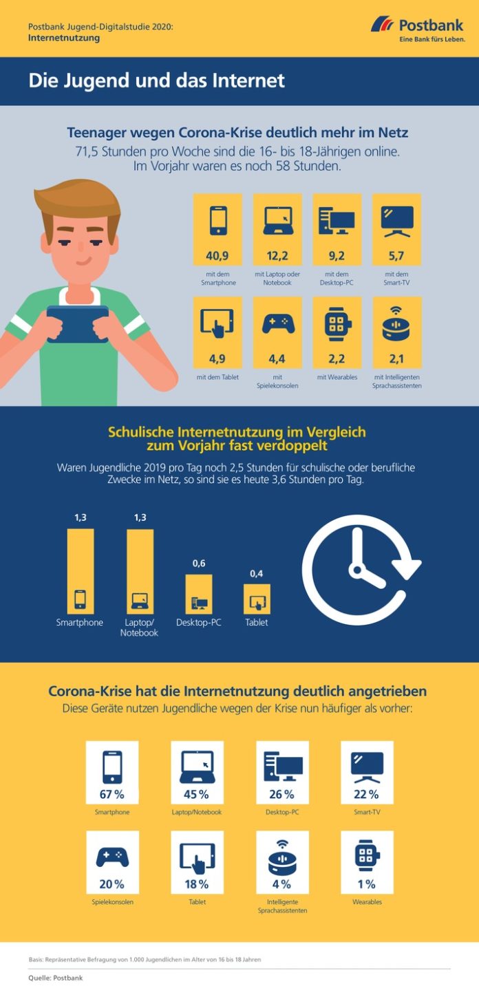 Im Vergleich zum Vorjahr ist die Nutzung des Internets unter Jugendlichen um 23 Prozent gestiegen. Waren Teenager 2019 noch 58 Stunden pro Woche im WWW unterwegs, so sind sie es in diesem Jahr 71,5 Stunden. Eine Ursache des massiven Anstiegs dürfte die Corona-Krise sein. Die repräsentative Befragung von 1.000 Jugendlichen im Alter zwischen 16 und 18 Jahren für die Postbank Jugend-Digitalstudie 2020 wurde im April und Mai 2020 durchgeführt.