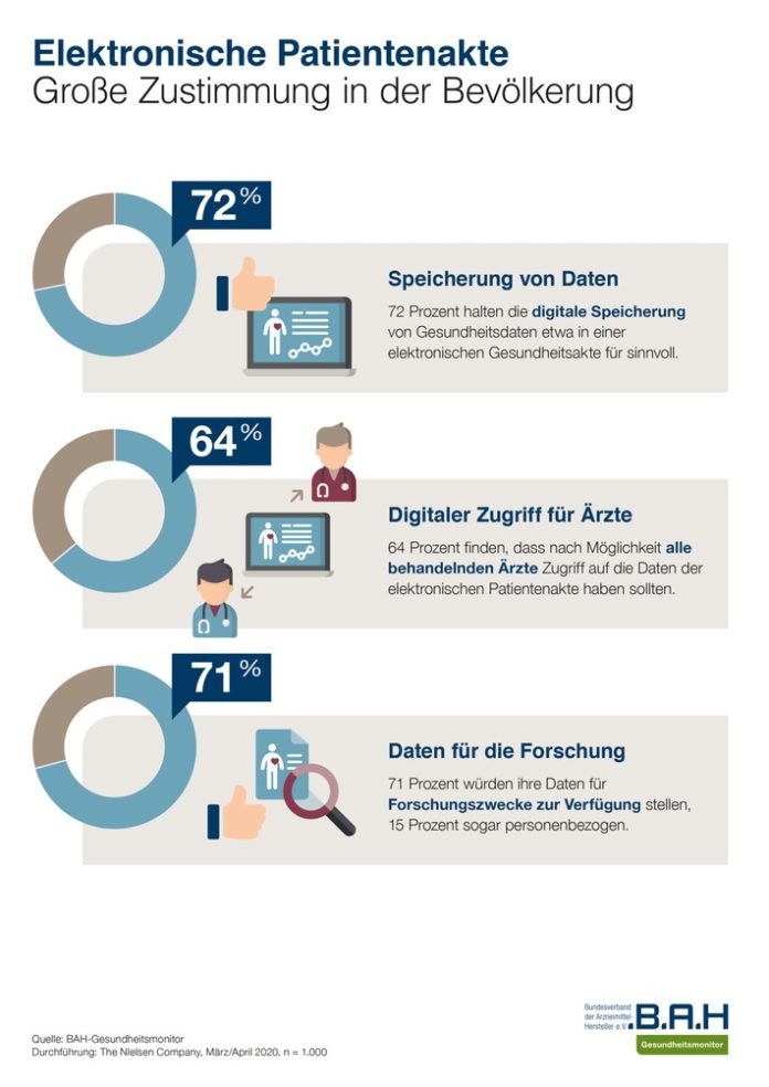 Berlin (ots) – Fast drei von vier Deutschen (72 Prozent) sind der elektronischen Patientenakte (ePA) gegenüber positiv eingestellt, weil mit ihr die Möglichkeit besteht, dass alle medizinisch behandelnden Akteure auf demselben Kenntnisstand sind. Das ist das Ergebnis einer repräsentativen Bevölkerungsbefragung im Rahmen des Gesundheitsmonitors des Bundesverbandes der Arzneimittel-Hersteller (BAH), die vom Marktforschungsinstitut Nielsen im Frühjahr 2020 unter 1.000 Personen durchgeführt wurde. Eine ähnlich große Mehrheit der Befragten (71 Prozent) würden ihre Daten außerdem für Forschungszwecke zur Verfügung stellen, 15 Prozent würden dies sogar mit personenbezogenen Daten tun.