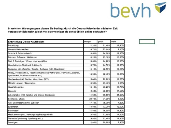 „E-Commerce hat sich im zweiten Quartal nachhaltig als zusätzliche Versorgungs-Infrastruktur etabliert“, fasst bevh-Hauptgeschäftsführer Christoph Wenk-Fischer zusammen. „Das zeigt sich nicht nur an den absoluten Zahlen, sondern auch am erklärten Willen der Konsumenten, auch künftig mindestens so viele, wenn nicht mehr Güter des täglichen Bedarfs und Medikamente online zu kaufen.“ In einer Zusatzbefragung unter ca. 2500 Konsumenten gab gut jeder Zweite der Befragten (53,6 Prozent) an, dass er aufgrund der Erfahrungen in der Corona-Krise künftig mehr online bestellen werde. Konkret nach Warengruppen gefragt, gaben 21,6 Prozent der Befragten an, mehr Lebensmittel online bestellen zu wollen; nur 11,6 Prozent gaben an, ihre Online-Ausgaben hier reduzieren zu wollen. Auch im Hinblick auf Medikamente, Drogerieprodukte und Tierbedarf äußerten deutlich mehr Befragte die Absicht, ihre Online-Einkäufe künftig zu steigern als sie zu verringern. Abseits der Waren des täglichen Bedarfs wollen die Konsumenten hauptsächlich bei Bekleidung und gedruckten oder elektronischen Büchern künftig eher mehr Geld im Internet ausgeben als weniger.