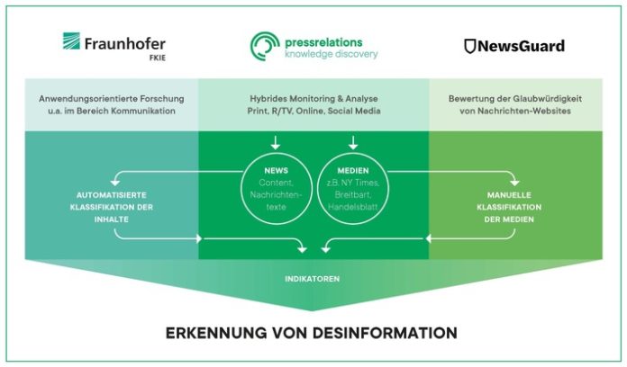 Düsseldorf (ots) – Der internationale Medienbeobachter pressrelations entwickelt in Zusammenarbeit mit dem Fraunhofer-Institut für Kommunikation, Informationsverarbeitung und Ergonomie FKIE sowie NewsGuard, einem Unternehmen, das Nachrichten-Websites nach Glaubwürdigkeit und Transparenz bewertet, ein intelligentes System zur Identifizierung potenzieller Falschmeldungen und Desinformationskampagnen. Mit dem Ziel, Orientierung in Zeiten sogenannter Fake News und Verschwörungstheorien zu bieten, kombinieren die drei Partner den Einsatz Künstlicher Intelligenz mit journalistischer Kompetenz in einem komplementären Prozess.