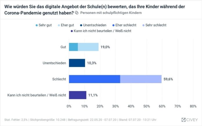 Berlin (ots) – Die Corona-Pandemie hat die Lücken der digitalen Bildung in Deutschland immens verdeutlicht, wie die neuesten Daten der repräsentativen Kurzstudie von Civey und Digitale Bildung für Alle e.V. zeigen. Nicht mal jede fünfte Person mit schulpflichtigen Kindern (19 Prozent) bewertet das digitale Bildungsangebot, das die Kinder während der Corona-Pandemie genutzt haben, als gut. Rund 60 Prozent sind hingegen unzufrieden. Damit stellen Eltern den Schulen im Land ein schlechtes Zeugnis über das digitale Angebot aus.