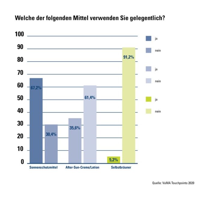 Sommer, Sonne, Sandstrand – klingt nach einem perfekten Urlaub. Damit die erholsame Auszeit auch gelingt, sollte jedoch der Sonnenschutz nicht vergessen werden. Denn abgesehen vom kurzfristigen und schmerzhaften Sonnenbrand drohen langfristig auch Hautschädigungen wie Krebs. Dennoch benutzen gemäß dem aktuellen Bericht VuMa Touchpoints 2020 nur 67,2 Prozent der befragten Konsumenten zumindest gelegentlich Sonnenschutzmittel. Ein gutes Drittel der Befragten (35,6 Prozent) pflegt die gestresste Haut nach dem Sonnenbad oder einer sonnenreichen Wanderung zudem mit After-Sun-Produkten.