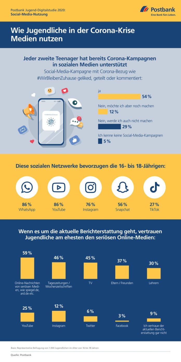 Für die Postbank Jugend-Digitalstudie 2020 wurden im April und Mai dieses Jahres 1.000 jugendliche Deutsche zwischen 16 und 18 Jahren repräsentativ befragt.