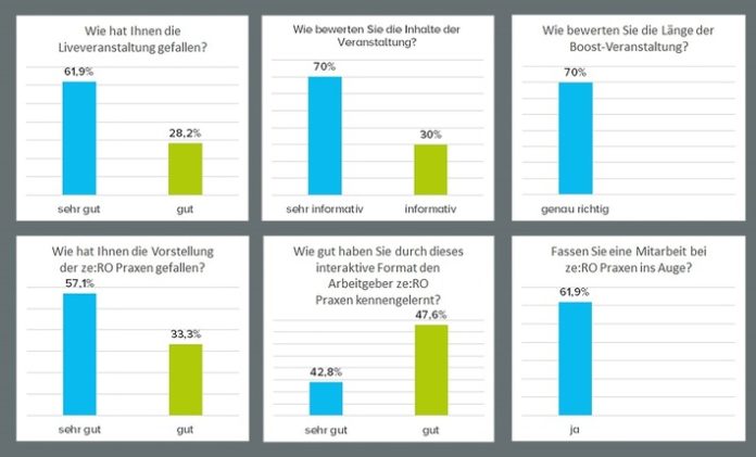 Niedernberg (ots) – Mit ihrer ersten Boost-Veranstaltung zur Besetzung offener Arztstellen sind die ze:roPRAXEN einen vollkommen neuen Weg gegangen. Etwa 50 potenzielle Bewerber haben das innovative Format „Boost“ am 26. Juni 2020 live genutzt. Inzwischen haben über 300 Zuschauer die Aufzeichnung über die unterschiedlichen Kanäle aufgerufen und gesehen. In einer UMFRAGE haben sich die ze:roPRAXEN dem Urteil der Teilnehmer gestellt.