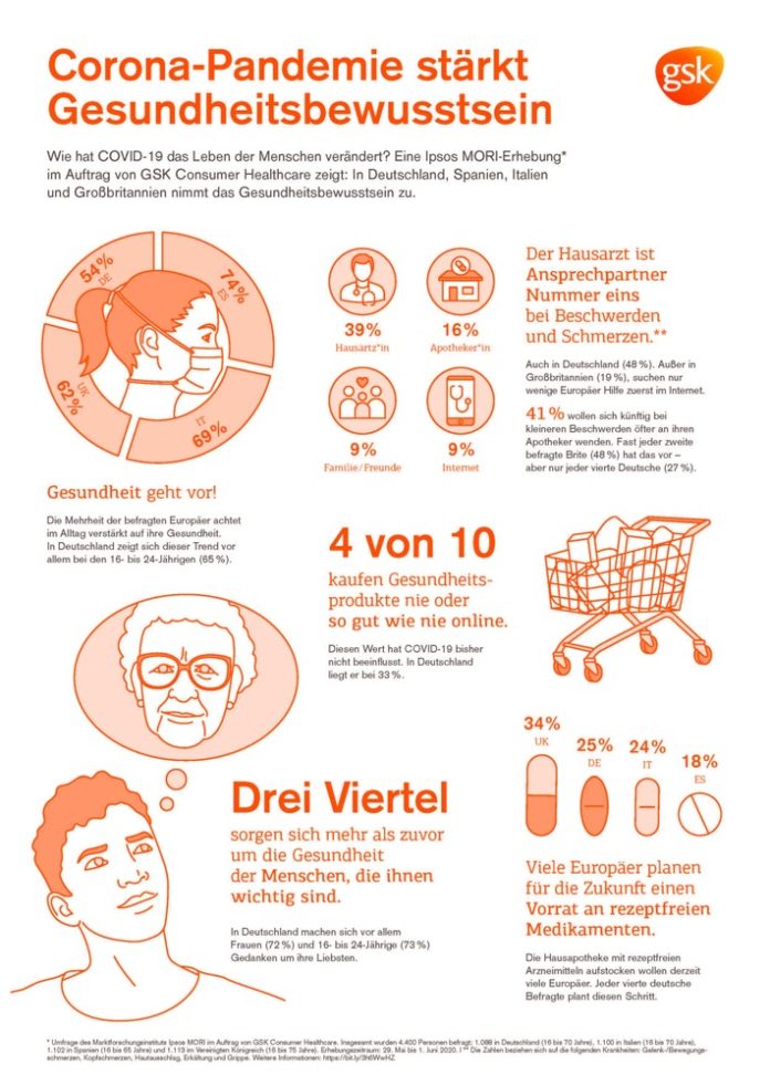 Seit Beginn des Jahres 2020 sind die Menschen weltweit mit den Auswirkungen der Corona-Pandemie konfrontiert. Im Rahmen einer Umfrage durch das Marktforschungsinstitut Ipsos im Auftrag des Gesundheitunternehmens GSK Consumer Healthcare unter etwa 1.000 deutschen Bürgern kam heraus, dass sich durch die Covid-19-Krise das Gesundheitsverhalten zum Positiven verändert hat. „Die Menschen nehmen ihre Gesundheit selbst in die Hand. Die Selbstmedikation spielt eine zentrale Rolle“, erklärt Victor Geus, General Manager DACH bei GSK Consumer Healthcare. „Die Pandemie ist wie eine Lupe, die vergrößert, was wichtig ist – die Gesundheit gehört dazu.“