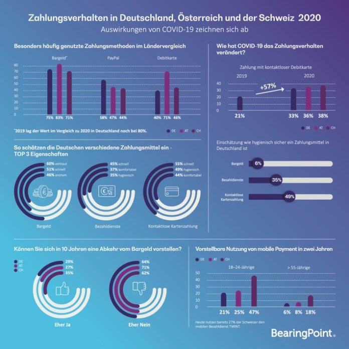 Frankfurt am Main (ots) – Die COVID-19-Krise verändert das Zahlungsverhalten: Aufgrund der erhöhten hygienischen Sensibilität boomt das kontaktlose Zahlen mit Giro- oder Kreditkarte. Das ergab eine YouGov-Umfrage im Auftrag der Management- und Technologieberatung BearingPoint. Cash is still King – aber bereits jede vierte Person in Deutschland vermeidet weitestgehend die Nutzung von Bargeld beim Bezahlen.* Der Online-Zahldienst Paypal belegt Rang 2 der bevorzugten Zahlungsmittel.