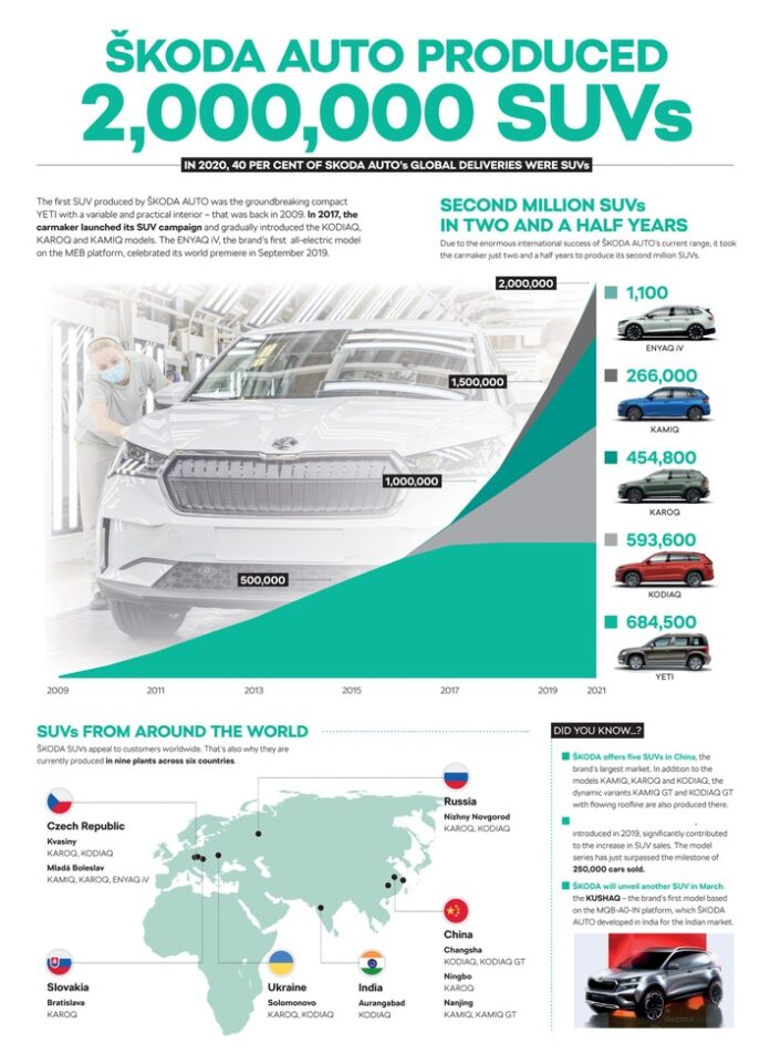 Mit der Weltpremiere des ŠKODA YETI legte der Automobilhersteller 2009 den Grundstein für seinen Erfolg im SUV-Segment. Bis zum Ende der Produktion im Jahr 2017 liefen 685.500 Einheiten des beliebten Modells vom Band. Zum Auftakt seiner SUV-Offensive präsentierte ŠKODA im gleichen Jahr den KODIAQ und den KAROQ. Mit den klassischen ŠKODA Tugenden – emotionalem Design, einem großzügigen Platzangebot und hoher Praktikabilität – knüpften beide nahtlos an den Erfolg des ŠKODA YETI an: Bis heute hat ŠKODA insgesamt rund 593.600 Einheiten des ŠKODA KODIAQ gefertigt und 454.800 ŠKODA KAROQ produziert.