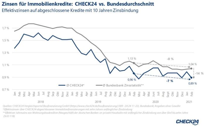 München (ots) – Immobilienzinsen sind im Februar gesunken und verbleiben auf niedrigem Niveau unterhalb der Ein-Prozent-Marke. CHECK24-Kund*innen zahlten im Schnitt 0,89 Prozent effektiv für Baudarlehen mit zehn Jahren Zinsbindung. Im Vorjahreszeitraum waren es 0,96 Prozent. Das entspricht einem Unterschied von sieben Prozent im Jahresvergleich.1)