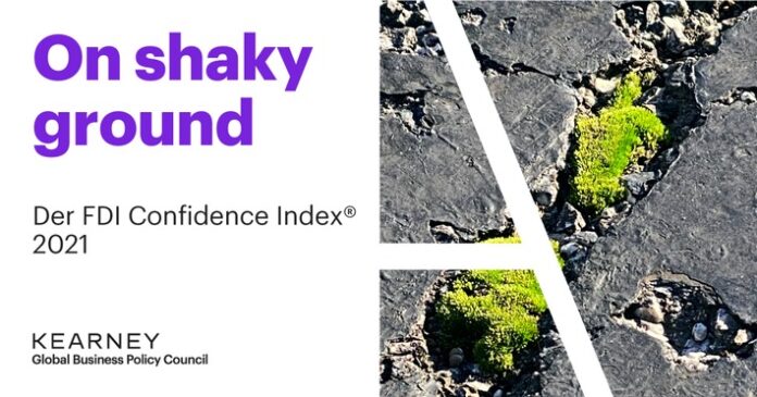 Düsseldorf (ots) – Die COVID-19 Pandemie, die Abwahl von Donald Trump und der Brexit haben bei den ausländischen Direktinvestitionen (FDI) tiefe Spuren hinterlassen. Wie hoch die Verunsicherung ist, zeigt der neue Vertrauensindex für Direktinvestitionen der globalen Unternehmensberatung Kearney. Das Ergebnis: Viele Anleger gehen auf Nummer sicher, kehren China den Rücken (minus 4 Plätze) und setzen auf sichere (Investment)-Häfen wie die USA, Kanada und Deutschland.