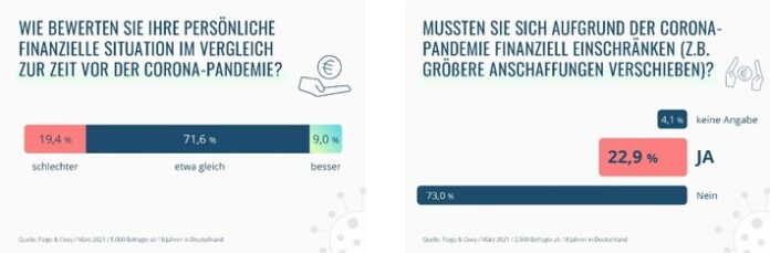 Rund 22 % der Jugendlichen zwischen 18 und 29 bewertet die persönliche finanzielle Situation im Vergleich zu vor der Corona-Pandemie schlechter. Rund 15 % sind aufgrund der Pandemie in Zahlungsverzug geraten – etwa 11 % mussten aufgrund von Engpässen gar einen persönlichen Kredit aufnehmen. Über 30 % der Menschen zwischen 18 und 39 Jahren geben an, dass sie aufgrund der Pandemie Ausgaben zurückhalten und größere Anschaffungen auf einen späteren Zeitpunkt verschieben müssen.