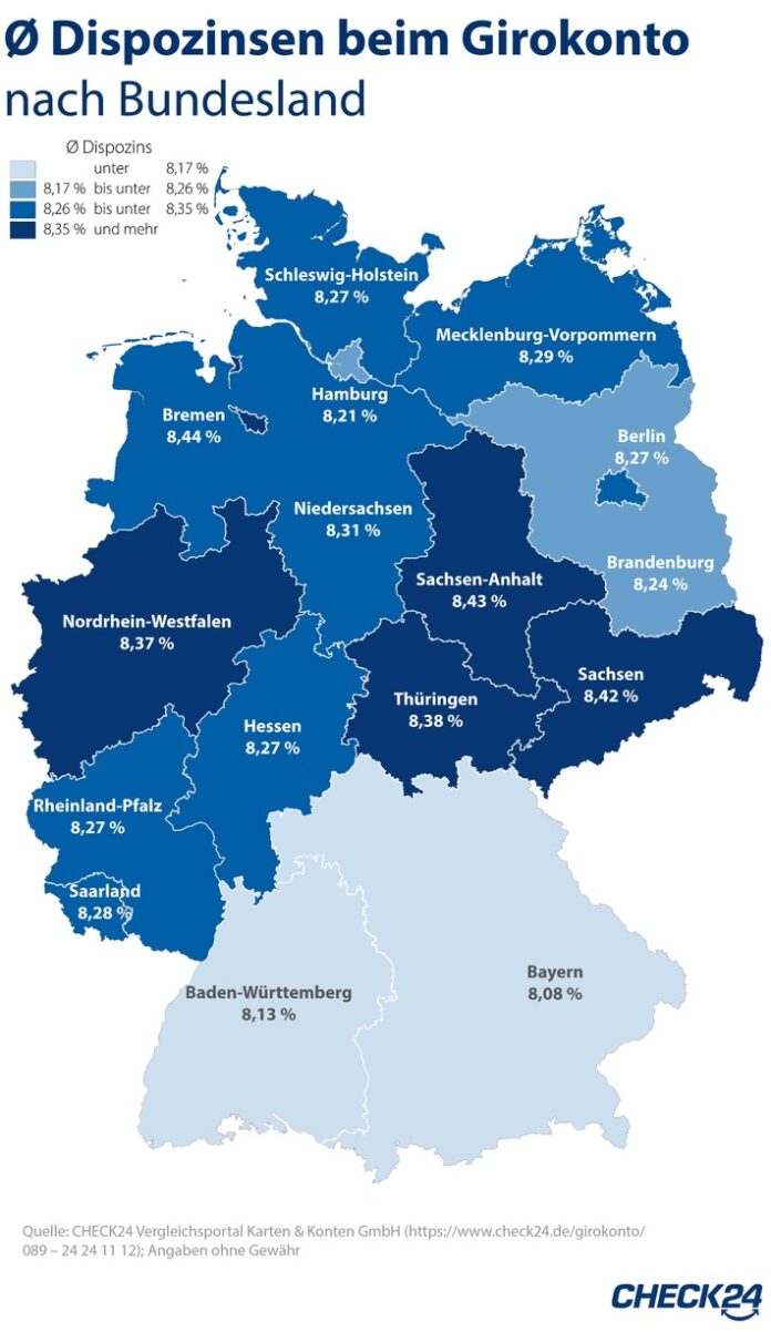 München (ots) – Trotz Niedrigzinsphase müssen Bankkund*innen in Deutschland hohe Zinsen zahlen, wenn sie ihr Konto überziehen. Im Durchschnitt fallen 8,26 Prozent Zinsen p. a. für einen Dispokredit an. Im Bundeslandvergleich müssen Verbraucher*innen aus Bremen mit 8,44 Prozent p. a. die höchsten Dispozinsen zahlen. Vier Prozent günstiger ist das Überziehen des Kontos in Bayern (8,08 Prozent p. a.). Das ergab eine Betrachtung aller im Jahr 2020 über CHECK24 abgeschlossenen Girokonten.