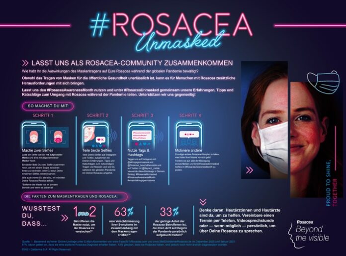 Düsseldorf (ots) – Pünktlich zum Rosacea-Awareness-Monat diesen April hat Galderma zusammen mit prominenten Rosacea- und Skin-Positivity-Influencer*innen die Kampagne #RosaceaUmmasked ins Leben gerufen. Ihr Ziel ist es, gerade während der aktuellen Pandemie, die öffentliche Diskussion zur wahren Belastung durch Rosacea – einer Hautkrankheit, von der in Deutschland schätzungsweise 10 Millionen Menschen betroffen sind [1] – zu intensivieren. Dabei wird die Rosacea-Community vereint und ermutigt, ihre Erfahrungen mit dem Tragen von Atemschutzmasken in Form von „Selfie“-Posts mit und ohne Maske in den sozialen Medien zu teilen. Hintergrund der Kampagne sind die Ergebnisse einer aktuellen Patientenbefragung, die zeigen, dass das Tragen der zurzeit unerlässlichen COVID-19-Masken nicht nur bei vielen Betroffenen die Symptome der Rosacea verschlimmert, sondern auch dazu führt, das Rosacea-Patienten seltener einen Arzt oder Dermatologen aufsuchen. [2,*]