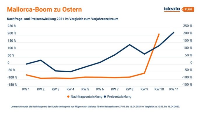* Untersucht wurde die Nachfrage und der Durchschnittspreis von Flügen nach Mallorca für den Reisezeitraum 27.03. bis 16.04.2021 im Vergleich zu 30.03. bis 18.04.2020.