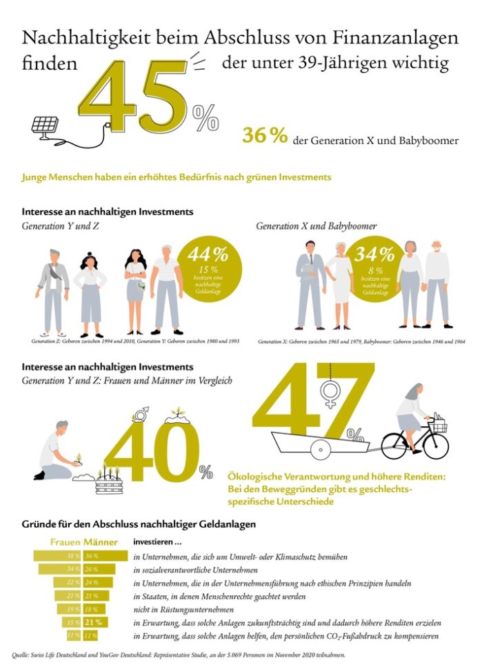 Hannover (ots) – Nachhaltigkeit gewinnt an Relevanz – auch im Kontext der eigenen Altersvorsorge und vor allem für die jüngere Generation. Das ist ein Ergebnis einer aktuellen und repräsentativen YouGov-Studie im Auftrag des Vorsorgeunternehmens Swiss Life Deutschland.(1) Demnach spielt für 45 Prozent der Generationen Y und Z Nachhaltigkeit in der Finanzanlage (2) eine wichtige Rolle. Bei den älteren Jahrgängen der Babyboomer und Generation X liegt der Wert bei lediglich 36 Prozent. „Die Studie zeigt, dass junge Menschen auch im Kontext ihrer Altersvorsorge an Nachhaltigkeit denken. Wenn sie langfristig anlegen, dann soll es ressourcenschonend geschehen“, sagt Jörg Arnold, CEO von Swiss Life Deutschland. Neben Unterschieden im Generationenvergleich, lassen sich auch Kontraste zwischen den Bundesländern ablesen: Im Süden zeigen Menschen bereits ein hohes Interesse an nachhaltigen Investments, die östlichen Bundesländer – mit Ausnahme von Berlin – sind weniger offen. Zudem variiert das Interesse an nachhaltigen Vorsorgelösungen zwischen den Geschlechtern.