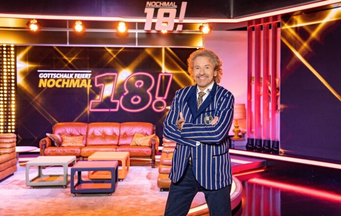 Seinen 18. Geburtstag feierte Moderator Kai Pflaume 1985 in der DDR. Darauf wird in „Gottschalk feiert: Nochmal 18!“ mit einem stilechten Mischgetränk aus Nordhäuser Doppelkorn und Cola angestoßen. „Ein Vorteil zu unserer Zeit war, dass das, was passiert ist, auch da geblieben ist, wo es passiert ist“, so Pflaume. „Von meinem 18. Geburtstag gibt es zum Beispiel kein Bild.“ Sehr wohl liegen hingegen Beweisfotos von seiner damaligen Minipli-Frisur vor, die das Show-Geburtstagskind ebenso schmunzelnd kommentiert wie seine früh entwickelte Vorliebe für den FC Bayern München. Auch Pflaumes schwunghafter Handel mit abfotografierten Mannschaftsbildern wird schonungslos aufgedeckt. Die Zeitreise in die 80er Jahre beinhaltet zudem Themen wie Schulterpolster, Glasnost und Breakdance. Und den perfekten Soundtrack dazu liefert Überraschungsgast Thomas Anders mit einem Modern-Talking-Medley.