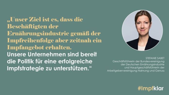 Berlin (ots) – In diesen Tagen finden die ersten Corona-Impfungen von Personen der Priorisierungsgruppe 3 statt, dazu gehören auch die Mitarbeitenden der Ernährungsindustrie.