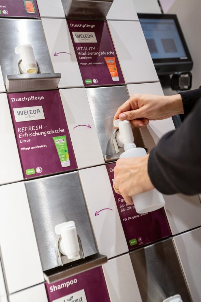 Im 100. Jahr der Firmengeschichte möchte Weleda mit diesem Pilotprojekt einen großen Schritt hin zu einem nachhaltigeren Konsumerlebnis machen. An einer Unverpackt-Station im Bereich Schönheit und Pflege in den drei Alnatura Super Natur Märkten Frankfurt am Main, Karlsruhe und Freiburg können Kund:innen zunächst vier beliebte Pflegeprodukte selbst abfüllen: