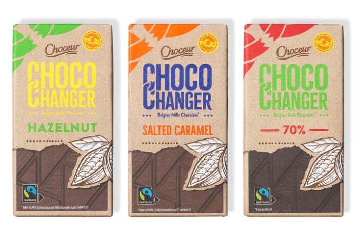 Die Kakaobohnen der Choceur CHOCO CHANGER stammen von Kooperativen in Côte d’Ivoire und Ghana. Ab sofort ist die nachhaltige Schokolade in den drei Sorten „Hazelnut“, „70 % Dark Chocolate“ und „Salted Caramel“ für einen Preis von je 1,99 Euro in allen ALDI SÜD und ALDI Nord Filialen erhältlich.