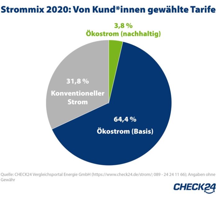München (ots) – Ökostrom (https://www.check24.de/strom/oekostrom/) wird immer beliebter: 68,2 Prozent der CHECK24-Kund*innen, die 2020 einen Stromvertrag abgeschlossen haben, entschieden sich für nachhaltigen oder Basis-Ökostrom. 2019 lag der Anteil noch bei 65,5 Prozent, 2018 sogar nur bei 55,5 Prozent.