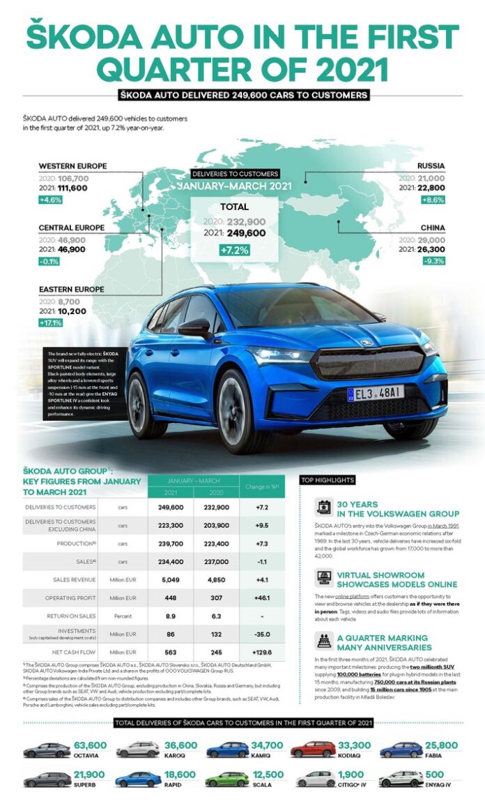 ŠKODA AUTO Vorstandsvorsitzender Thomas Schäfer erklärt: „Wir sind stark ins neue Jahr gestartet und blicken auf ein sehr gutes erstes Quartal zurück – trotz heftiger Gegenwinde durch die Pandemie und die Halbleiterknappheit. Ich bedanke mich bei der gesamten ŠKODA Mannschaft, unserem Sozialpartner KOVO sowie unseren Importeuren und Händlern für das große Engagement. Auch für die nächsten Monate sind wir optimistisch: Die ersten Fahrzeuge unseres vollelektrischen SUV ENYAQ iV sind ausgeliefert, die Nachfrage übertrifft unsere Erwartungen. Außerdem haben wir weitere tolle Produktneuheiten wie die neue FABIA-Generation in der Pipeline. Unser kürzlich gestartetes Effizienzprogramm wirkt nicht nur den negativen Auswirkungen der Pandemie und der Lieferengpässe entgegen, sondern stellt ŠKODA im Wettbewerb auch langfristig stärker auf.“