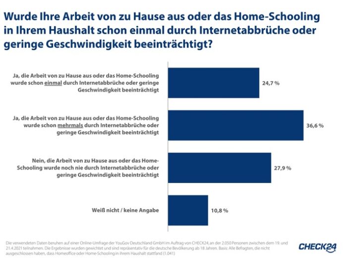 München (ots) – Homeoffice und Home-Schooling gehören in der Corona-Pandemie seit über einem Jahr zum Alltag. Doch bei 61 Prozent der Deutschen, die in ihrem Haushalt Erfahrung mit Homeoffice oder Home-Schooling sammelten, sorgen Internetabbrüche und langsames Netz für Frust. In einer repräsentativen YouGov-Umfrage im Auftrag von CHECK24 geben knapp 25 Prozent der Befragten an, dass ihre Arbeit von zu Hause oder das Home-Schooling schon einmal durch Internetabbrüche oder langsame Geschwindigkeit beeinträchtigt wurde. Bei weiteren 37 Prozent kam das sogar mehrmals vor.1)