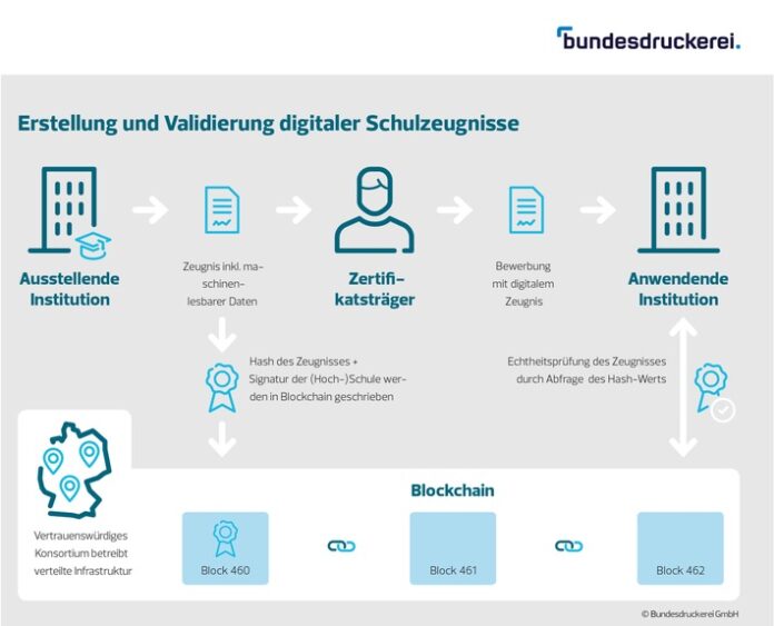 Berlin (ots) – Einfach, fälschungssicher und datenschutzkonform – das digitale Schulzeugnis rückt näher. Gemeinsam mit der Bundesdruckerei GmbH entwickelt die ebenenübergreifende Genossenschaft govdigital ein System, um digitale Schulzeugnisse zu erstellen, zu sichern und zu prüfen. Das Finanzministerium Sachsen-Anhalt war im Rahmen des Onlinezugangsgesetzes (OZG) als federführend für das Themenfeld Bildung benannt worden und unterzeichnete nun einen entsprechenden Vertrag mit govdigital. Der Pilotbetrieb wird im Sommer 2021 in den Bundesländern Berlin, Nordrhein-Westfalen und Rheinland-Pfalz starten. Bis Ende 2022 können alle interessierten Bundesländer an das Projekt angeschlossen werden – zunächst zur Probe, ab 2023 im Echtbetrieb.