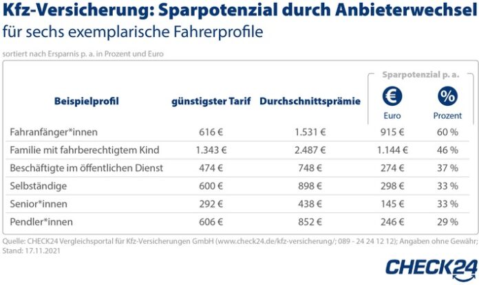 Das größte prozentuale Sparpotenzial haben Fahranfänger*innen. Im günstigsten Tarif zahlen sie jährlich 616 Euro. Im Schnitt über alle Tarife werden 1.531 Euro fällig – ergibt eine Ersparnis von bis zu 60 Prozent bzw. 915 Euro im Jahr. Eine Familie mit fahrberechtigtem Kind spart durch den Wechsel des Kfz-Versicherers jährlich sogar bis zu 1.144 Euro bzw. 46 Prozent des Versicherungsbeitrags. Für Selbstständige liegt die mögliche Ersparnis bei 298 Euro im Jahr verglichen mit der Durchschnittsprämie.