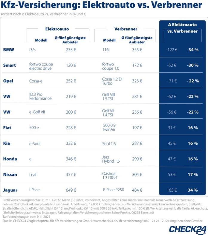 „Unsere Berechnungen zeigen, dass die Kfz-Versicherung für Elektroautos in einigen Fällen günstiger ist als für vergleichbare Verbrenner“, sagt Dr. Rainer Klipp, Geschäftsführer Kfz-Versicherungen bei CHECK24. „Versicherer kalkulieren für jedes Pkw-Modell Faktoren wie Unfallhäufigkeit oder die Anzahl an Diebstählen. Fahrer*innen von E-Autos scheinen oft sicherer im Verkehr unterwegs zu sein als Halter*innen von Verbrennern.“