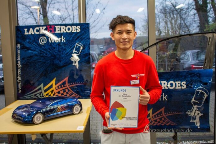High-End-Kreativität trifft hier nämlich auf Präzision: Über zwei Wettbewerbstage mussten die zwölf Teilnehmenden eine Autotür beschriften und lackieren, eine Werbetafel gestalten und ein Automodell mit der Lackpistole designen. Der Wettbewerb, der dieses Jahr im Nachwuchszentrum eines renommierten Lackherstellers abgehalten wurde, fand unter dem Motto „Lackheroes@ Work“ statt. Besonders den sechs jungen Frauen unter den Teilnehmern machte der Wettbewerb viel Spaß: „Es freut mich sehr, dass immer mehr Frauen unseren Beruf ergreifen. Sie begeistert die pure Lust an Farbe und Kreativität sowie die Faszination Automobil“, erklärt Paul Kehle, Präsident der Bundesfachgruppe Fahrzeuglackierung im Bundesverband Farbe Gestaltung Bautenschutz. Da aufgrund der Corona-Pandemie letztes Jahr kein Bundesleistungswettbewerb abgehalten werden konnte, wurde gleich doppelt für 2020 und 2021 prämiert: Neben Habibi stürmte Ruben Apitzsch (2020) aus Halle aufs oberste Treppchen. Die zweiten Plätze belegten Alina Hahn aus Nordrhein-Westfalen und Sabine Bonatz aus Schleswig-Holstein (2020). Dritter wurde Lukas Obeck aus Niedersachen.